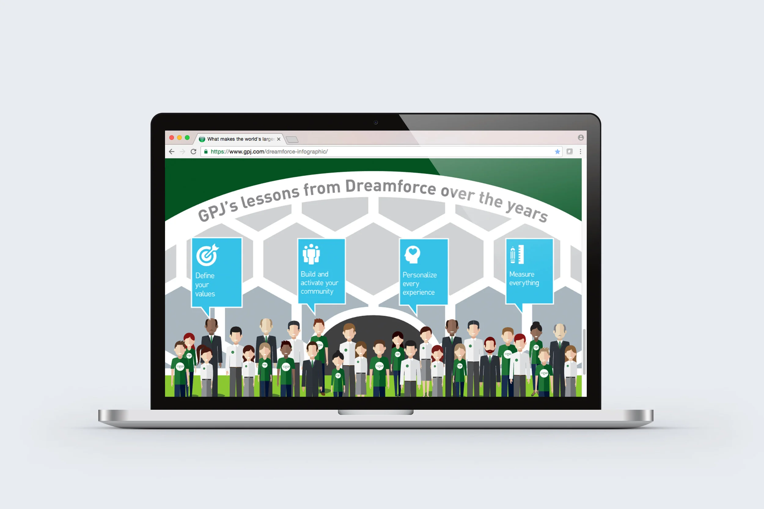 Infographics are such a great way to get a lot of information to the audience in a concise and beautiful manner when done correctly. For highlighting measurements from the country's largest tech conference put on by our client, Dreamforce, a static infographic was not going to cut it. So we made it an interactive infographic through parallax scrolling.